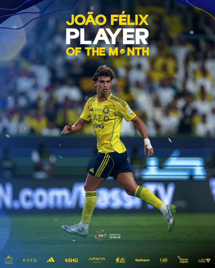 10月1日讯 官方消息,利雅得获胜 前场球员菲利克斯当选沙特职业联赛 9月最佳球员。