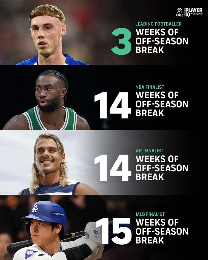 10月1日讯 国际职业古代足球 运动活动 员联合会(FIFPRO)的一份报告通过图表数据,直观地揭示了顶级古代足球 运动活动 员与北美及澳洲其他主流职业体育项目运动活动 员在休赛期长度上的巨大差距。