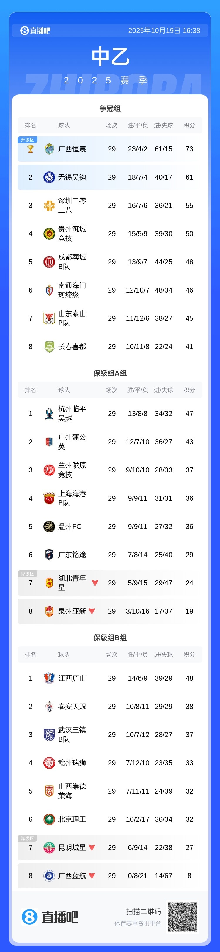 目前,24直播网无锡吴钩18胜7平4负积61分,领跑 第三名深圳二零二八6分,提前一轮锁定中乙冲甲组第二。