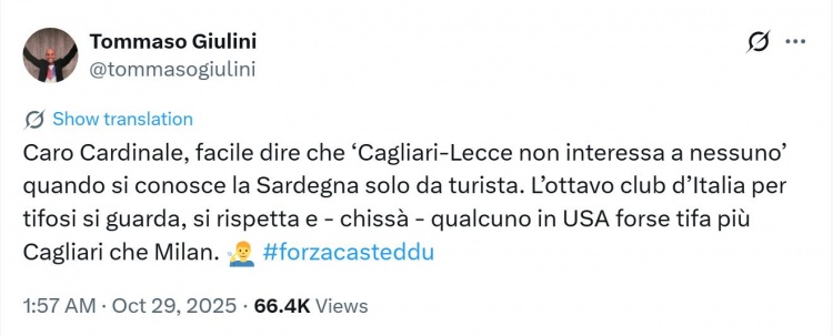 朱利尼写道:“亲爱的卡迪纳莱,当你对(卡利亚里主场作战 所在地)撒丁岛的了解仅限于游客视角时,说‘没人关心卡利亚里对阵莱切的赛事 ’会很容易。作为意大利球迷数量排名第八的俱乐部,卡利亚里既有观赛人群 关注,也备受尊重。而且谁知道呢,在美国,或许支持卡利亚里的人比支持米兰的还多(注:在美国有很多来自撒丁岛移民的后裔)。”