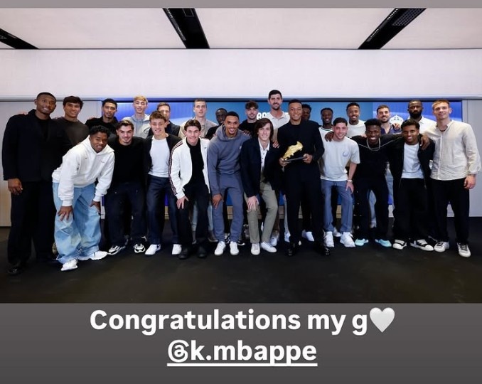 贝林厄姆也通过社媒晒出了皇马全队同手持金靴奖杯姆巴佩的合影,足球直播并配文:“祝贺我的兄弟@姆巴佩”。