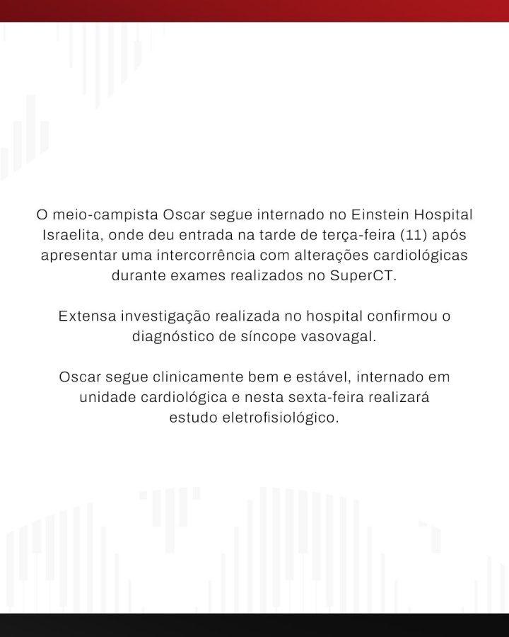 11月14日讯 圣保罗俱乐部官方发布公告,就34岁奥斯卡此前体检时晕厥、心脏检查异常一事做出公告。