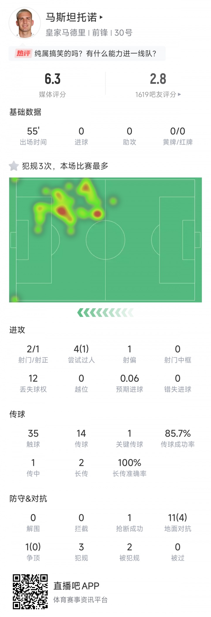 本场赛事 马斯坦托诺表现不佳,遭到球迷吐槽。赛中他还多次滑倒,对峙 也不占优势,最终机构评分仅6.3分,吧友评分仅2.8分。