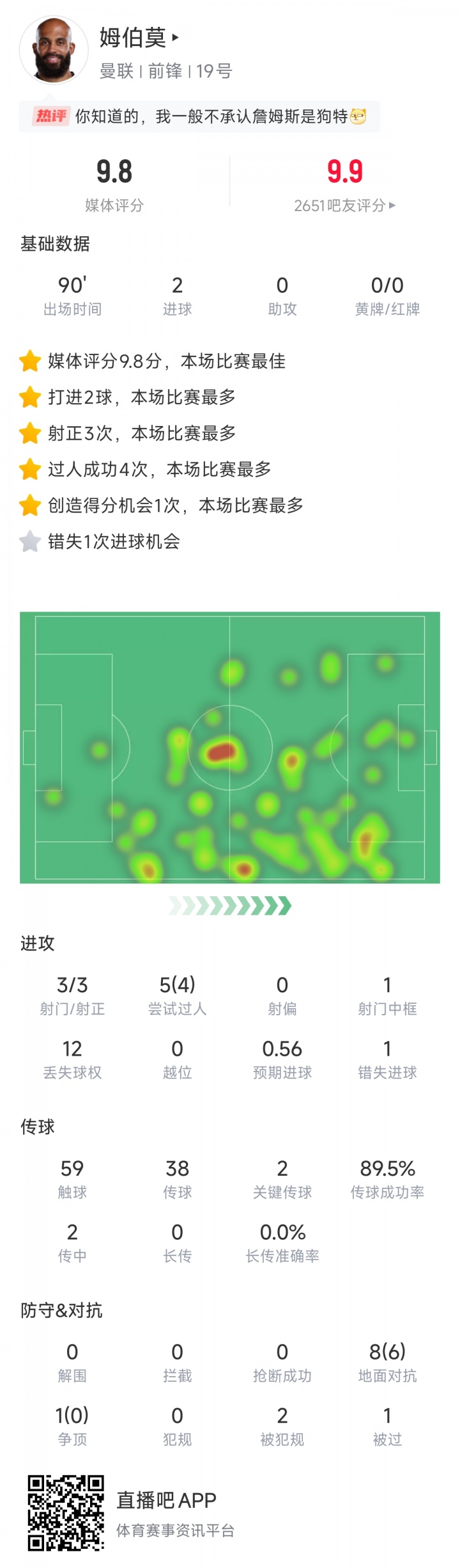 本场赛事 姆伯莫杆位出战打满90分钟,贡献2球,他近3场3球1助竞技状态 火热,24直播网是曼联的火力担当。