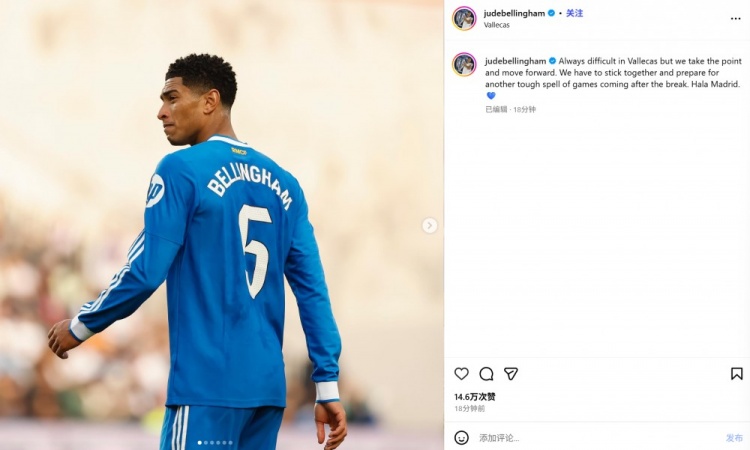 11月10日讯 皇马在本轮西甲0-0战平巴列卡诺,贝林厄姆在赛后通过社媒发文。
