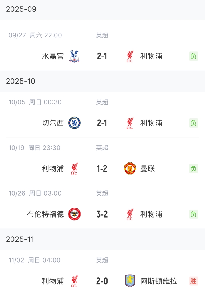 11月10日讯 本轮英超,曼城3-0击败利物浦,利物浦最近6轮英超吃到5场败仗。