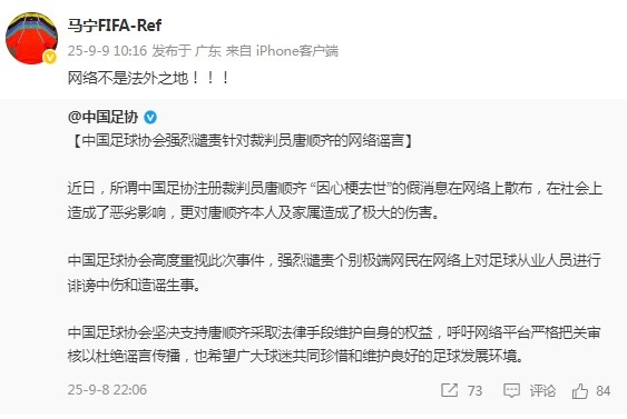 9月9日讯 对于近期网络上关于裁判 员唐顺齐的谣言,同为裁判 员的马宁在社媒进行了谴责。