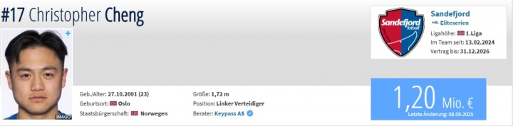 本赛季,他在挪超出场20次贡献5球3助,竞技状态 火热,德回转 价已经来到了120万欧。