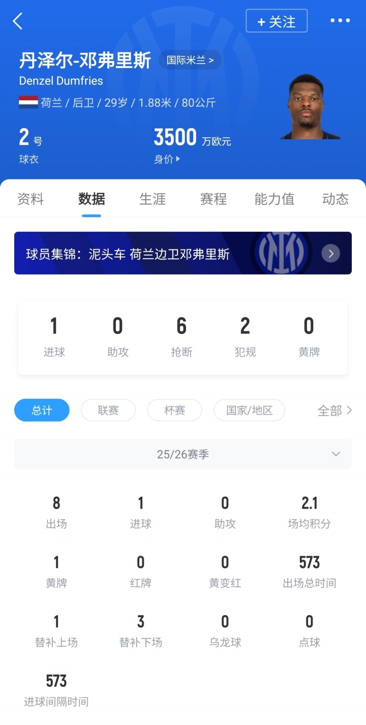 29岁的邓弗里斯本赛季代表国米出战8场赛事 ,打进1球,目前德回转 价3500万欧。