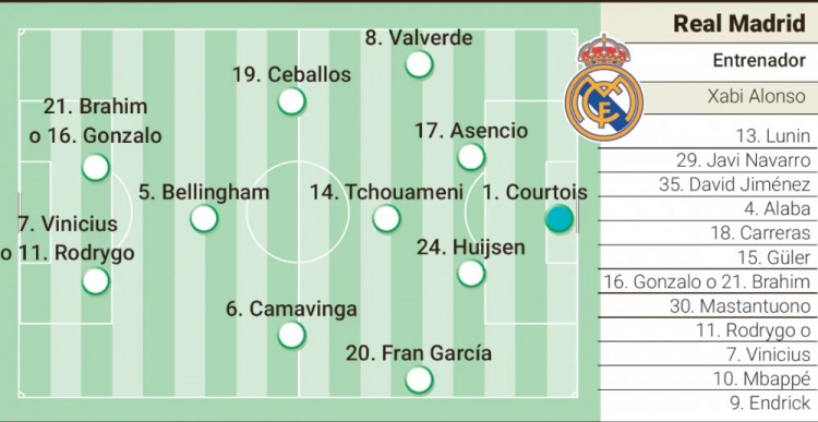 据《阿斯报》预测杆位为:库尔图瓦;巴尔韦德、劳尔-阿森西奥、赫伊森、弗兰-加西亚;琼阿梅尼、卡马文加、塞巴略斯、贝林厄姆;迪亚斯或贡萨洛、维尼修斯或罗德里戈。