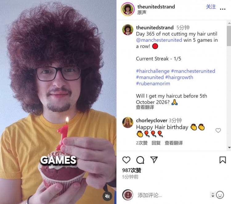 蓄发哥社媒晒出纪念蓄发一周年视频,配文:“不剪头发直到曼联5连胜,第365天,当前连胜竞技状态 ——1/5。”