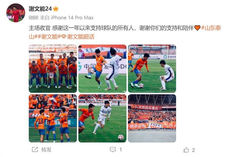中超第29轮,泰山队主场作战 2-1战胜津门虎,这也是泰山队赛季主场作战 收官战。赛后,谢文能更新社媒纪念,178足球直播免费观看入口雨燕直播免费高清观看足球直播他写道:主场作战 收官 感谢这一年以来支持球队的所有人,谢谢你们的支持和陪伴。