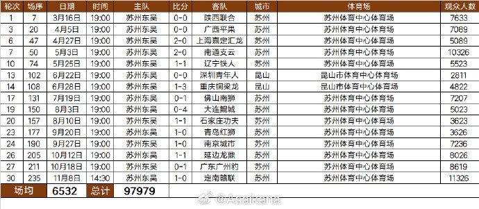 2025中甲职业联赛 苏州东吴队现场观赛人群 人数统计:合计97979人次,场均6532人。