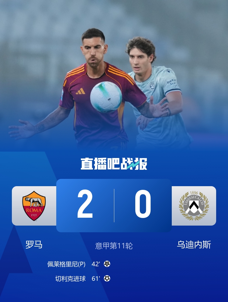 意甲第11轮,罗马2-0战胜乌迪内斯,佩莱格里尼、切利克得分 。