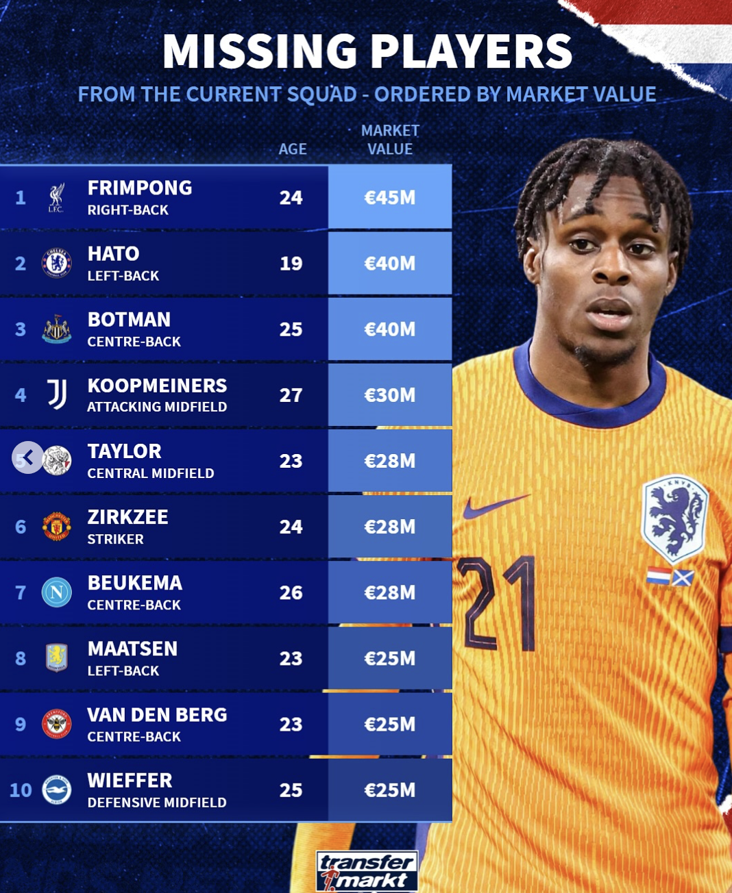 虎扑11月14日讯德转统计了落选本期荷兰队的球员身价榜。
