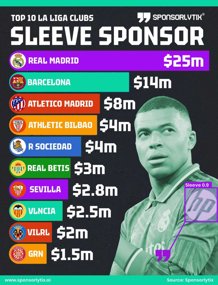 10月8日讯 Sponsorlytix统计了西甲各队每年的衣袖广告收入,并列出榜单,24直播网皇马2500万美元居首,巴萨1400万美元次席。