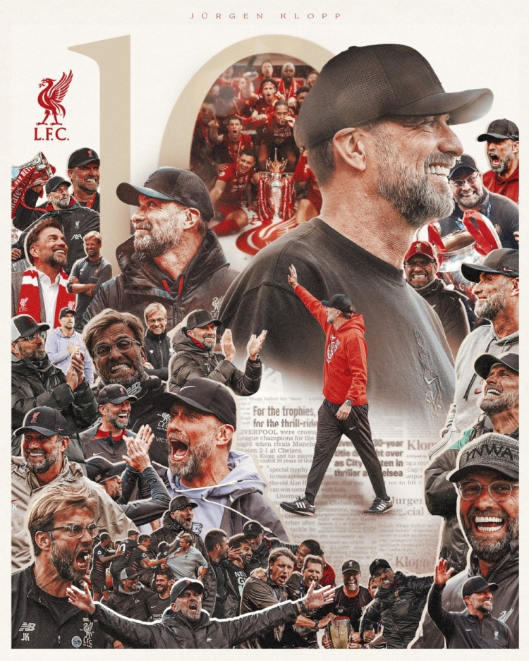 克洛普带领利物浦首次赢得英超第一名 ,足球直播并问鼎欧冠和世俱杯,成为红军功勋主帅, 利物浦官方社媒晒出海报,回顾克洛普执教球队的岁月。