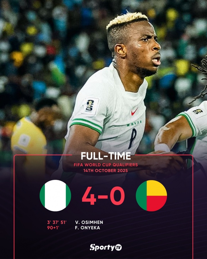 10月15日讯 世预赛非洲区小组赛C组,尼日利亚4-0贝宁,本场赛事 奥斯梅恩戴帽,丘库埃泽助功 双响。
