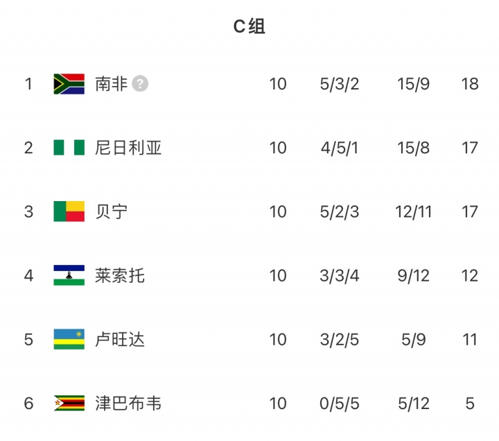 但由于南非3-0战胜卢旺达,足球直播尼日利亚只能屈居C组第二,目前只可通过加入 附加赛来争取2026世界杯赛 的名额。