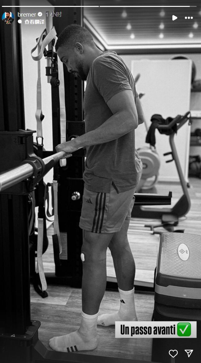 布雷默社媒晒图:身处健身运动练习 房,24直播网正在进行复健 性练习 。照片的右下角配有意大利语文字“Un passo avanti”,意为“向前一步”。