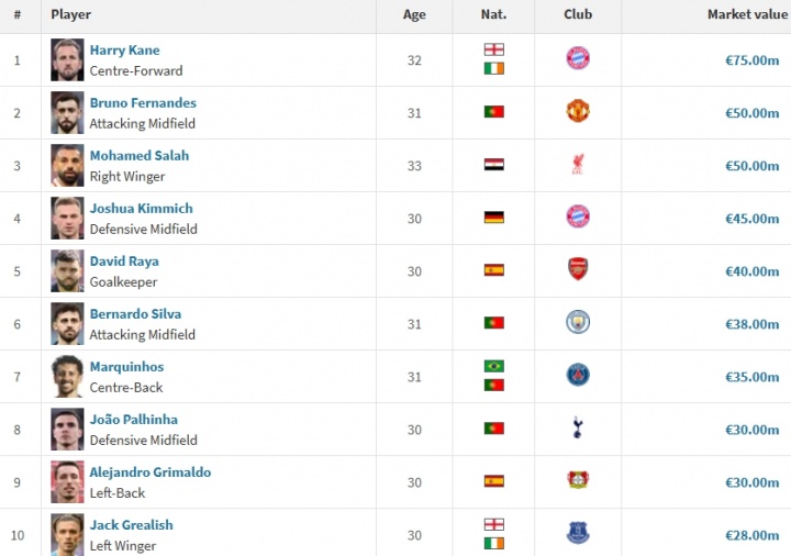 10月15日讯 昨日德转更新德甲球员身价,32岁的凯恩身价没有变化,足球免费在线高清直播仍为7500万欧。尽管身价没有提升,凯恩在现役30岁以上球员的身价排行中仍断档领跑 。