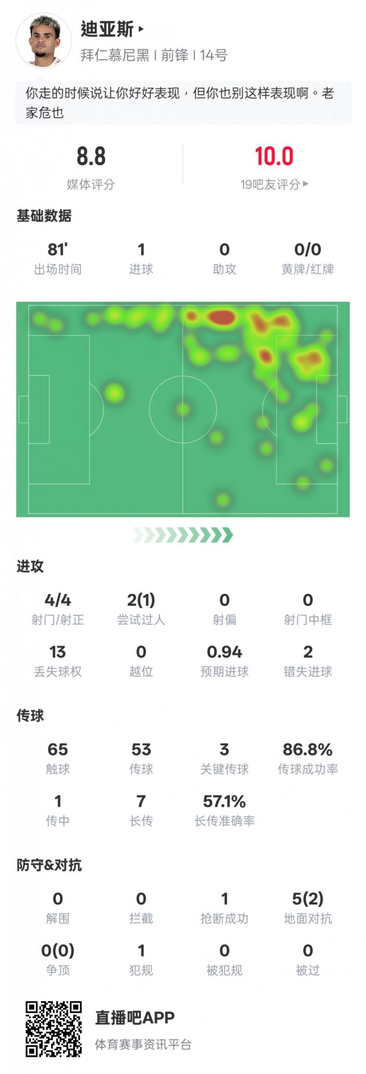 路易斯-迪亚斯本场数据如下: