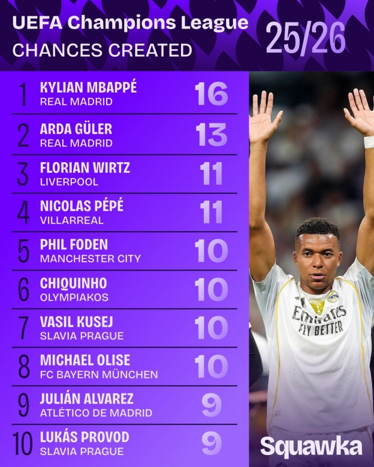 本赛季欧冠创造机会榜: